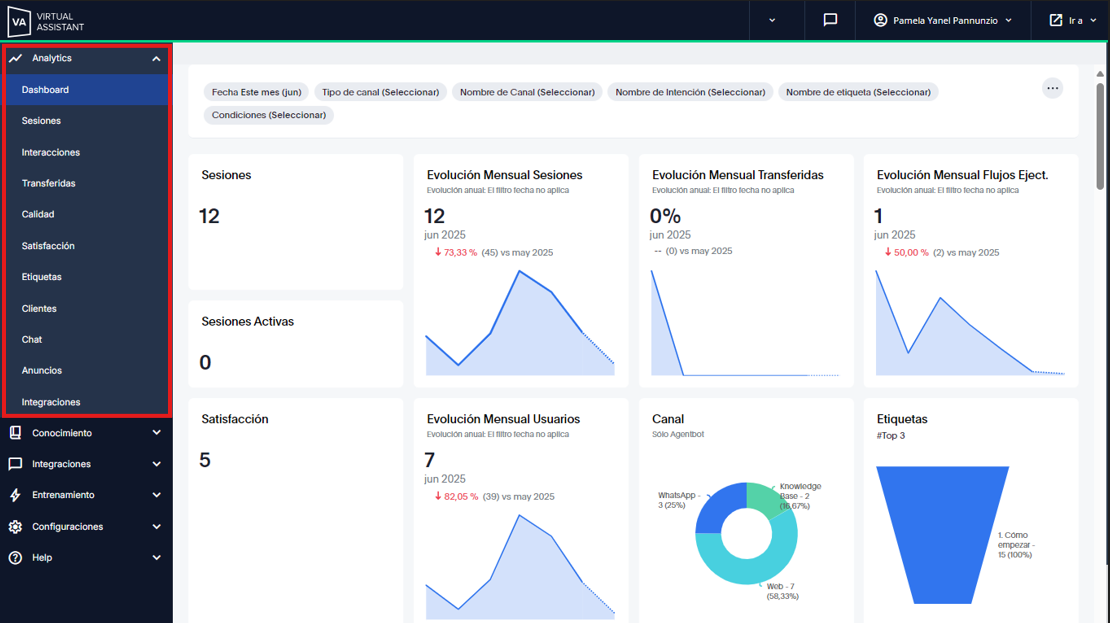 En cada uno contarás con un encabezado de filtros con distintas opciones que te permitirán cruzar datos y evaluar el comportamiento de tu asistente virtual, según distintas variables.